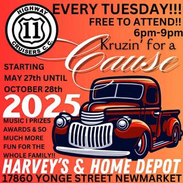The club has been raising money for various charities over the years including SickKids, JumpStart, Southlake Regional Health Centre, Princess Margaret Cancer Centre, Big Brothers Big Sisters of York, Canadian Crime Victims Foundation and many more. We do this through events like our weekly cruise nights which are held every Tuesday from late April until early November at the Harvey’s and Home Depot on Yonge Street in Newmarket. The club also holds many other charity events during the season such as our Summerfest show that is held at the Sharon Temple in Sharon, Ontario, our Halloween Trunk or Treat show and Kruze-a-Palooza that is held at the Sharon Temple.